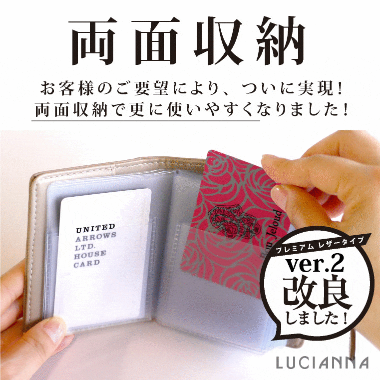累計販売個数 85,000個突破! LUCIANNA カードケースシリーズ ついに!コンパクトの本革タイプが コンパクト/プレミアムレザー「ver.2」へ \ バージョンアップ!/ コンパクト/プレミアムレザー「ver.2」ココがポイント! ・両面収納 お客様のご要望により、ついに実現! 両面収納で更に使いやすくなりました! ・カード40枚収納 今まで、裏表に収納して40枚収納だったところが、 1ポケットにカードを1枚入れて40枚収納可能に。